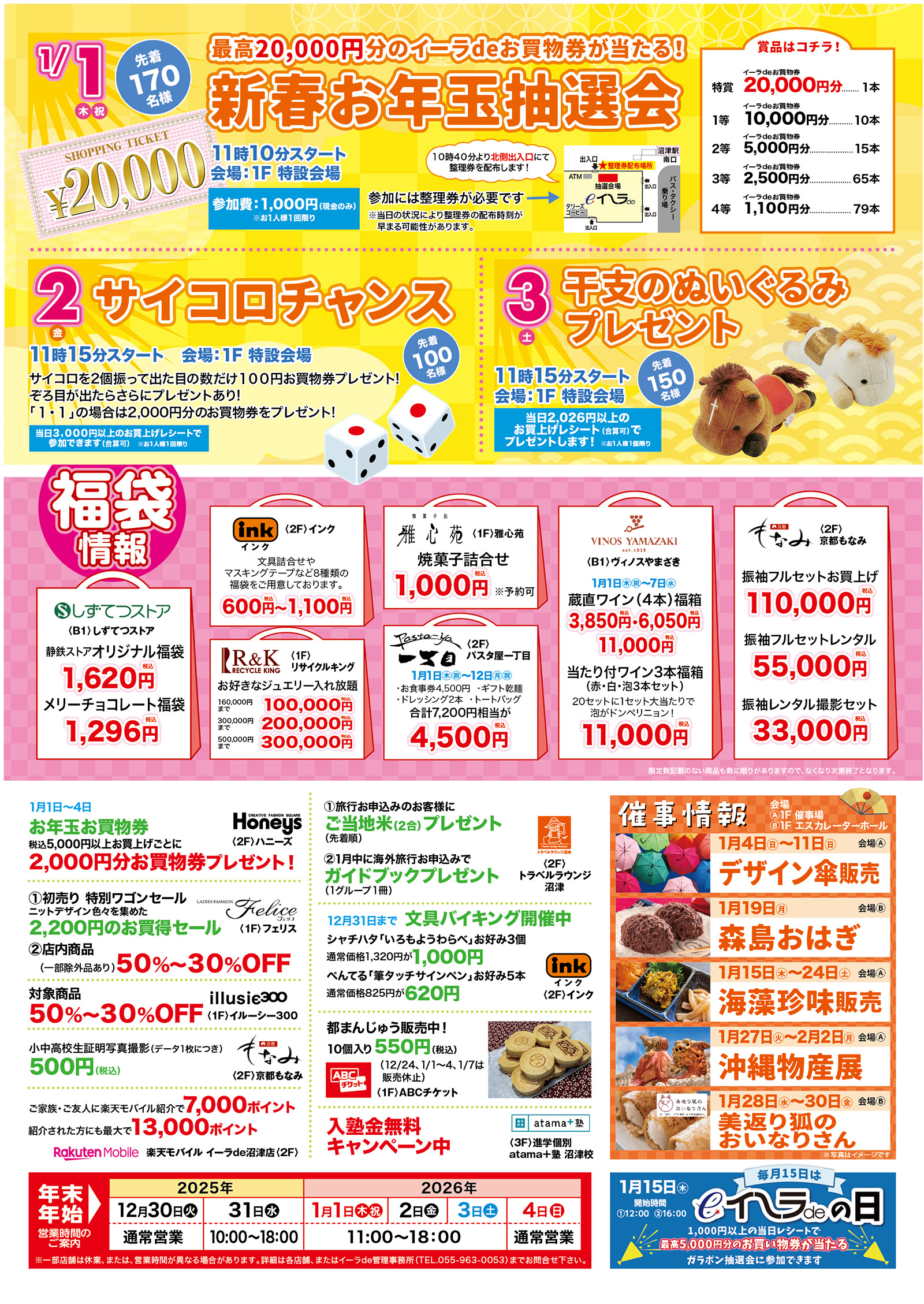 恒例のお年玉抽選会から干支ぬいぐるみプレゼントまで、また各店におかれましても様々なイベントをご用意しております。