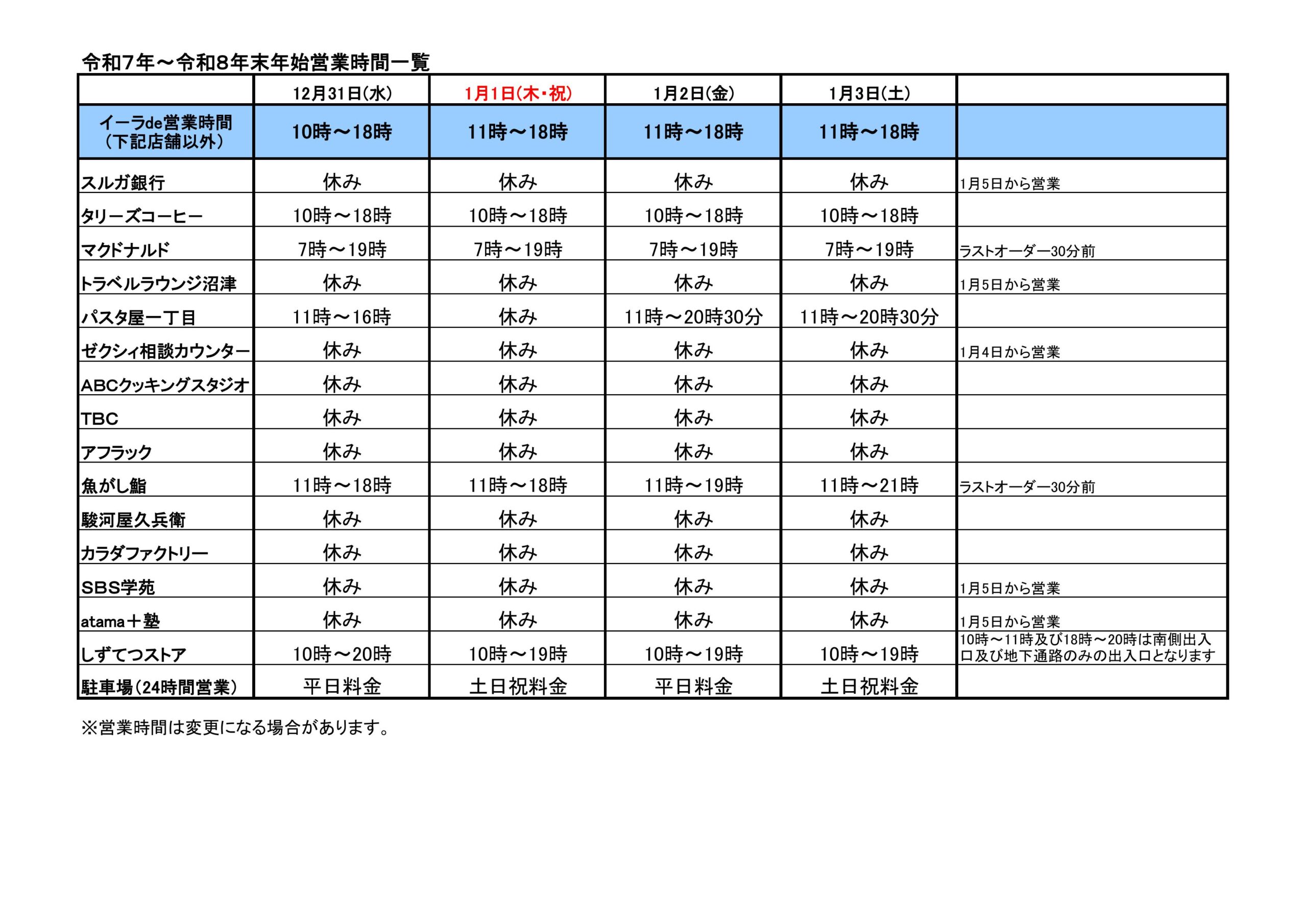 年末年始の営業時間は下記の通りとなります。 尚、営業日は変更になる事がありますので予めご了承ください。 ラストオーダーについては各店舗にご確認ください