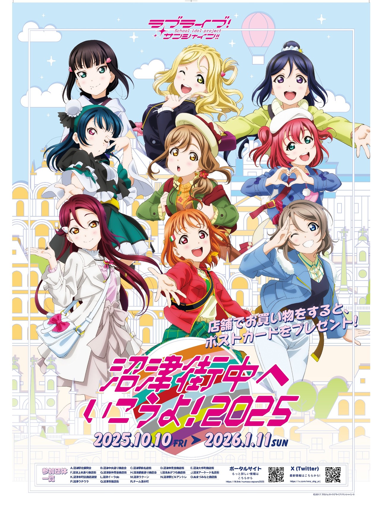 沼津街中へいこうよ!2025 10月10日~1月11日まで対象店舗で一定条件をお買上げいただくとラブライブサンシャインのポストカードをプレゼントします。 数に限りがありますのでお急ぎください